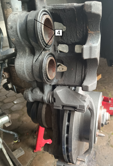 Eine handelsübliche Scheibenbremse besteht aus einer Bremsscheibe (1), die an der Radachse befestigt ist, sich also immer mit dem Rad mit dreht, einem schwimmenden Bremssattel (2) und den beiden Bremsklötzen mit den Bremsbelägen (3), die sich beidseitig der Scheibe befinden, und durch die sich die Scheibe hindurch dreht. Übrigens: schwimmender Sattel ist wichtig, damit sich die Bremsbeläge, die sich am Sattel auf beiden Seiten der Bremsscheibe befinden, gleichmäßig an selbiger anlegen. Dass davor noch ein Hauptbremszylinder, Bremsschläuche und ein ESP- oder ESC-Aggregat (für Dein ABS) kommen, beschreibe ich hier nur auf der Tonspur. Bei Problemen an diesen Bauteilen ist unbedingt eine Werkstatt aufzusuchen. Im Sattel (im Bild unten hochgeklappt dargestellt) wiederum befinden ein, zwei oder auch drei Bremszylinder (4), die über den Bremsschlauch mit Hydraulikflüssigkeit (Bremsflüssigkeit) gefüllt sind. Außerdem hat deine Bremse einen Raddrehzahlsensor, den du nicht siehst, und einen Bremsbelagsensor. Ersterer leitet die Drehzahl des Rades an das ESP-Steuergerät weiter, während letzterer dich bei abgefahrenen Bremsbelägen warnt mit dem notice, diese zu erneuern. Dazu aber später...