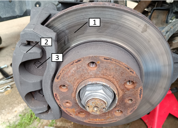 Eine handelsübliche Scheibenbremse besteht aus einer Bremsscheibe (1), die an der Radachse befestigt ist, sich also immer mit dem Rad mit dreht, einem schwimmenden Bremssattel (2) und den beiden Bremsklötzen mit den Bremsbelägen (3), die sich beidseitig der Scheibe befinden, und durch die sich die Scheibe hindurch dreht. Übrigens: schwimmender Sattel ist wichtig, damit sich die Bremsbeläge, die sich am Sattel auf beiden Seiten der Bremsscheibe befinden, gleichmäßig an selbiger anlegen. Dass davor noch ein Hauptbremszylinder, Bremsschläuche und ein ESP- oder ESC-Aggregat (für Dein ABS) kommen, beschreibe ich hier nur auf der Tonspur. Bei Problemen an diesen Bauteilen ist unbedingt eine Werkstatt aufzusuchen. Im Sattel (im Bild unten hochgeklappt dargestellt) wiederum befinden ein, zwei oder auch drei Bremszylinder (4), die über den Bremsschlauch mit Hydraulikflüssigkeit (Bremsflüssigkeit) gefüllt sind. Außerdem hat deine Bremse einen Raddrehzahlsensor, den du nicht siehst, und einen Bremsbelagsensor. Ersterer leitet die Drehzahl des Rades an das ESP-Steuergerät weiter, während letzterer dich bei abgefahrenen Bremsbelägen warnt mit dem notice, diese zu erneuern. Dazu aber später...