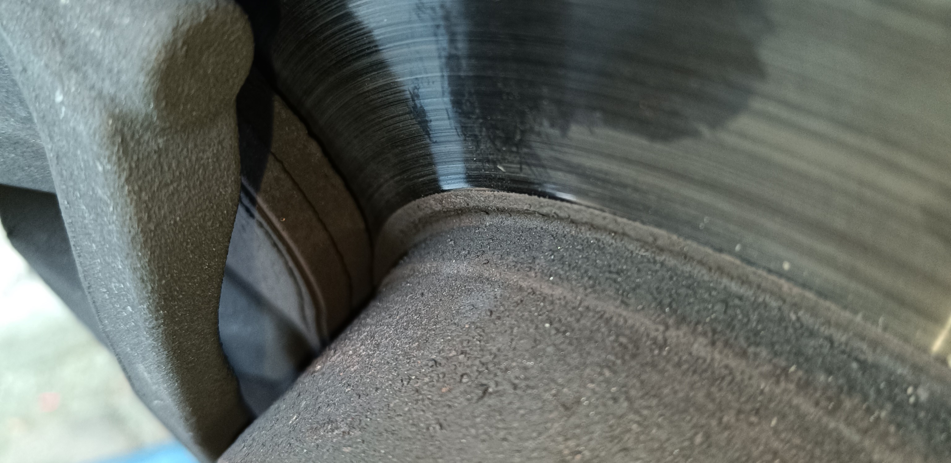 Ein dritter Indikator ist die Stärke der Bremsbeläge. Ihr habt zwar einen Bremsbelagdickensensor im Fahrzeug und wenn der auslöst, könnt Ihr, je nach Fahrstil auch noch hundert Kilometer weiterfahren, doch wenn ich weiß, ich fahre in vier fünf Wochen im kommenden Urlaub 4-5Tkm, wechsel ich die Dinger lieber vorher und warte nicht, bis die gelbe Lampe im Kombiinstrumen leuchtet. Das tut sie nämlich gemäß Murphy's Law immer am maximal weitestentfernten Punkt eurer Reise. Auch das Prüfen der Bremsbeläge kann auf der Strasse bei motierten Rädern geprüft werden. Dazu mußt Du von Schräg oben in den Sattel schauen. Dort siehst Du die Bremsbeläge, die auf die Bremsklötze aufgeklebt sind. Beide sind normalerweise recht gut vonenander zu unterscheiden. Da du nicht direkt herankommst, musst du jetzt schätzen: Ist der Bremsbelag nur noch etwa 5mm dick, also etwa so dick wie ein Smartphone ohne Hülle oder etwa ein Bleistift, sollten sie gewechselt werden.